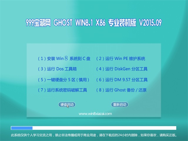 999宝藏网 GHOST WIN8.1 X86 专业版 v2015.09采用微软官方32位win8.1简体中文版系统精心封装制作而成。集成了最新安全补丁和系统升级程序,支持在线更新。该系统拥有高效的装机过程,兼营性、稳定性、安全性较均强,一键实现装系统、驱动、备份文件等一系列流程。采用NTFS格式,拥有安全稳定的运行环境,华丽的界面和优美的开关机音乐以及精美的主题,适合各种台式机,同时也适合笔记本安装。全面提升系统在计算机上的部署速度!独创全新的系统双恢复模式,解决了某些SATA光驱和有隐藏分区的电脑不能正常安装系统的问题。系统全自动无人值守安装,无需输入序列号,安装完成后使用administrator账户直接登录系统,系统通过微软正版验证,支持在线更新。且系统安全无病毒,无捆绑任何流氓软件,999宝藏网 GHOST WIN8.1 X86 专业版 v2015.09适合于所有台式电脑和笔记本电脑安装!