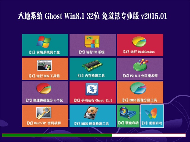 大地系统 Ghost Win8.1 32位 免激活专业版 v2015.01通过一键分区、一键装系统、一键Ghost备份等一系列手段,使装系统花费的时间缩至最短,极大地提高了工作效率,安装可在无人看管的情况下完成。装机任务再多,也能从容应付。一键还原的备份和恢复可以在系统崩溃的情况下进行。进入系统前按相关选项后,使用者就可转身去做其它事情,其间不需要看管。自动判断笔记本电脑或台式电脑键盘类型,并自动开启台式键盘数字指示灯,欢迎广大用户安装使用!