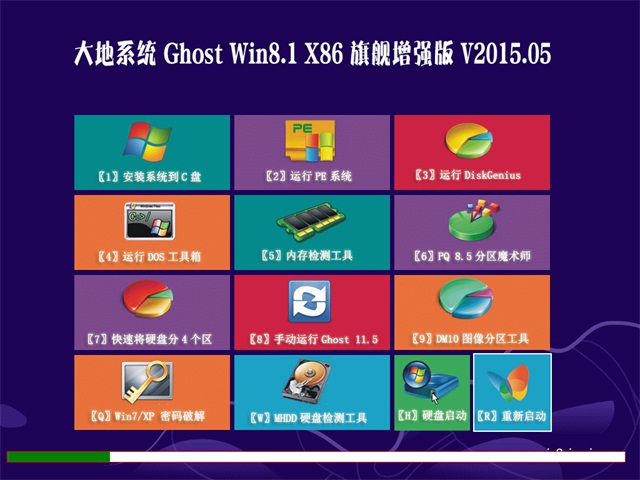 大地系统 GHOST WIN8.1 x86 旗舰增强版 2015.05智能检测笔记本,如果是笔记本则自动关闭小键盘;破解原系统桌面主题的限制,可直接使用第三方主题。局域网共享:默认不通。请在开始菜单“程序栏”菜单中找到局域网共享设置工具,运行设置后重启即可。我的电脑右键加入了设备管理器、服务、控制面板、方便大家使用;禁用如关闭错误报告,关闭帮助等一些服务,提高系统性能,欢迎大家安装使用。