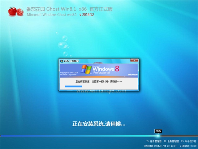 番茄花园 Ghost Win8.1 X86 (32位) 官方正式版 v2014.12拥有人性化的专业体验,原装系统进行终极优化,更稳定,更快速,更安全,让系统处于一个最佳的状态。它采用了新的是内核技术,大幅度提升了开关机速度,采用了类似休眠的关机方法,关机时系统会保存内存数据和系统状态,移动到硬盘空间后再关闭电源。是一款值得拥有的装机系统!