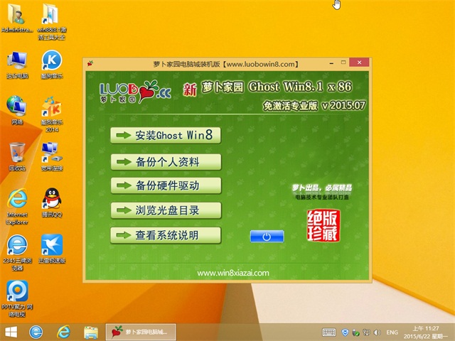新萝卜家园(XLBJY) Ghost Win8.1 专业装机版 V2015.07基于微软官方专业版制作,采用Win8.1 32位微软正版做为源安装盘!系统集成必备硬件驱动和软件,采用NTFS格式,拥有安全稳定的运行环境!系统安装完毕自动卸载多余驱动,稳定可靠,确保恢复效果接近全新安装版!本系统通过微软官方检测,安装了截止目前全部微软关键补丁,大家放心下载使用!