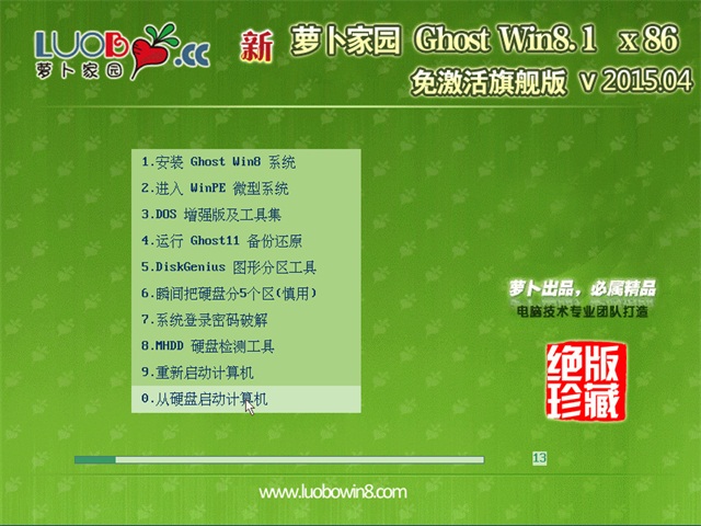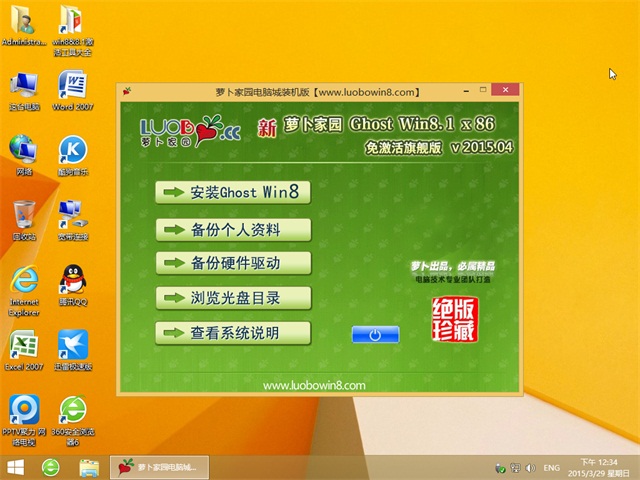 新萝卜家园Ghost Win8.1 X86 免激活旗舰版 v2015.04通过先进的互联网多媒体技术功能,无论是最早的系统还是最新配置都可以使用,高效安全的稳定性和可选择性,驱动软件可选择集成软件。萝卜家园系统适用于大众化,同时也是使用率非常高的windows装机系统装机方便。系统经过专业人员进行全方位的安全体检,而且系统还提供自带应用软件安装、卸载、升级等全方位服务,保障系统运行流畅,是 一款装机必备的好帮手!值得大家拥有!