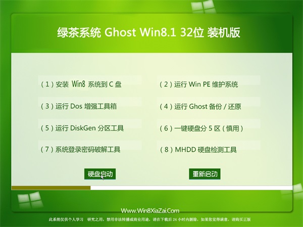 绿茶 GHOST WIN8.1 (32位) 装机版 V2016.06系统适应性高、绿茶兼容性好、绿茶性能强劲的优点,绿茶同时万能驱动,Flash Player插件,VC++等运行库都更新到最新。以系统稳定为第一制作要点,收集市场常用硬件驱动程序,安装维护方便快速 - 集成常见硬件驱动,智能识别+预解压技术,绝大多数硬件可以快速自动安装相应的驱动。安装全过程约6分钟,部分机子可达5分钟,高效的装机过程,同时本版在封装前预先优化各项目、清除系统垃圾、优化启动项,开机最快为15秒(机械硬盘)。禁用远程注册表、远程运行程序,等易受攻击组件,自动激活无需值守,第一次登录桌面自动清理系统垃圾,启动项、残留恶意插件,深得网友喜爱,欢迎下载绿茶 GHOST WIN8.1 (32位) 装机版 V2016.06体验。