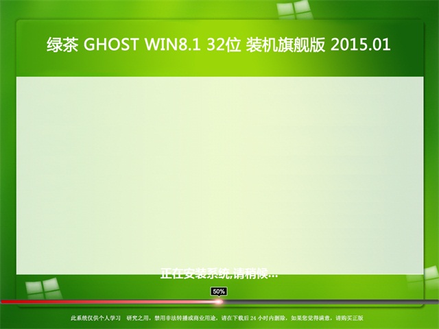 绿茶 GHOST WIN8.1 32位 装机旗舰版 2015.01系统主要适用于笔记本、品牌机,同时支持组装兼容性极强,可通过微软验证,可在线更新,可放宽心安心使用。智能判断自动卸载多余设备驱动,节省大部分的内存空间,自动清除系统盘病毒侵略。不含任何病毒、木马或者流氓软件,放心安装使用。安装过程实现全自动进程,通过一键便可完成所有程序的安装。适合电脑城,个人快速装机使用!