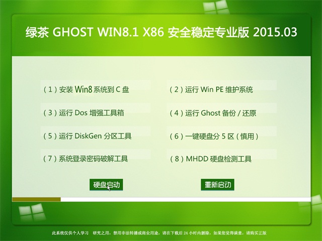 绿茶系统 GHOST WIN8.1 X86 安全稳定专业版 2015.03系统主要适用于笔记本、品牌机,同时支持组装兼容性极强,可通过微软验证,可在线更新,可放宽心安心使用。智能判断自动卸载多余设备驱动,节省大部分的内存空间,自动清除系统盘病毒侵略。不含任何病毒、木马或者流氓软件,放心安装使用。安装过程实现全自动进程,通过一键便可完成所有程序的安装。适合电脑城,个人快速装机使用!