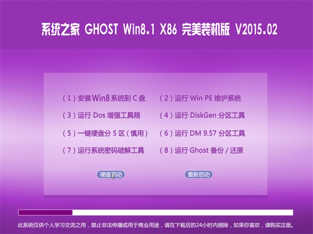 系统之家Ghost Win8.1 X86 完美装机版 V2015.02是采用微软官方原版而制作的系统盘,系统保持原汁原味的,全程采用无人安装,全自动安装流程,而且在一定程度上节约大部分安装时间。也结合很多实用的功能,稳定、安全、高效率的系统操作。一键实现装系统、驱动、备份文件等一系列流程。是款安装好帮手,花费最少时间大大提高工作效率。是款值得大家安装使用的系统,欢迎大家安装使用!