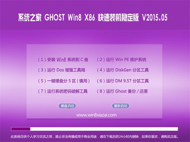 系统之家 GHOST WIN8.1 x86 快速装机稳定版 2015.05采用最新激活技术,永久激活100%,实现新老硬盘智能识别功能,删除了系统中不必要的隐含组件,为用户争取最大化的空间和速度,修正原系统缺陷的地方如网页XBM图片不能显示的问题。在不影响大多数软件和硬件运行的前提下,已经尽可能关闭非必要服务。系统支持光盘启动一键全自动安装及PE下一键全自动安装,自动识别隐藏分区,方便快捷。