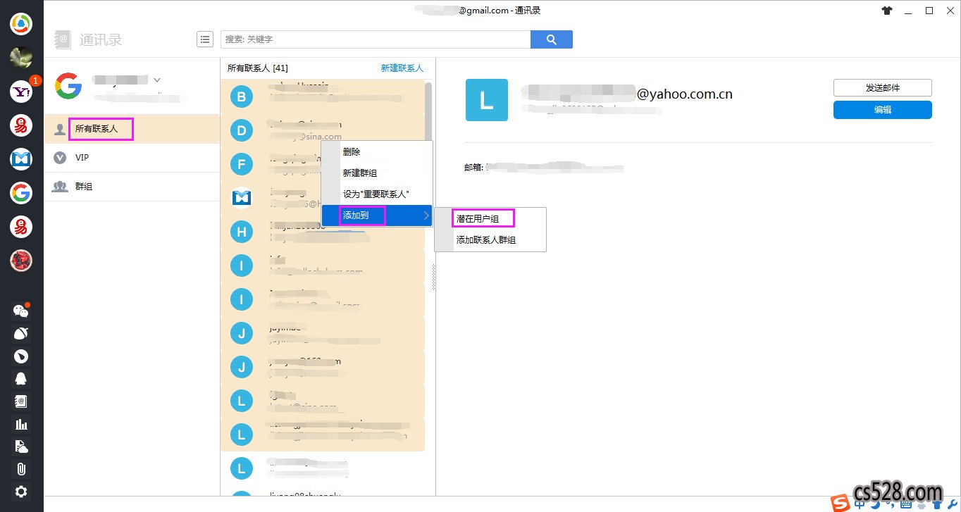 4、如果定期给一个群体发送邮件,可以建立群组操作,完成上面的联系人批量导入后,点“所有联系人”– 批量选取 特定联系人 –鼠标右键“添加到”– 新建分组如“潜在客户”组;